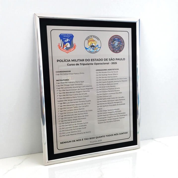Produzida em aço inox de alta qualidade, esta placa é altamente resistente à corrosão e ao desgaste, garantindo a preservação de sua estética e integridade por muitos anos. Complementando a peça está uma moldura de alumínio prata com dimensão de 40x30cm, que oferece um suporte robusto e um acabamento refinado. Seja para homenagear pessoas, celebrar eventos importantes ou marcar conquistas, sua confiabilidade e elegância são insuperáveis.